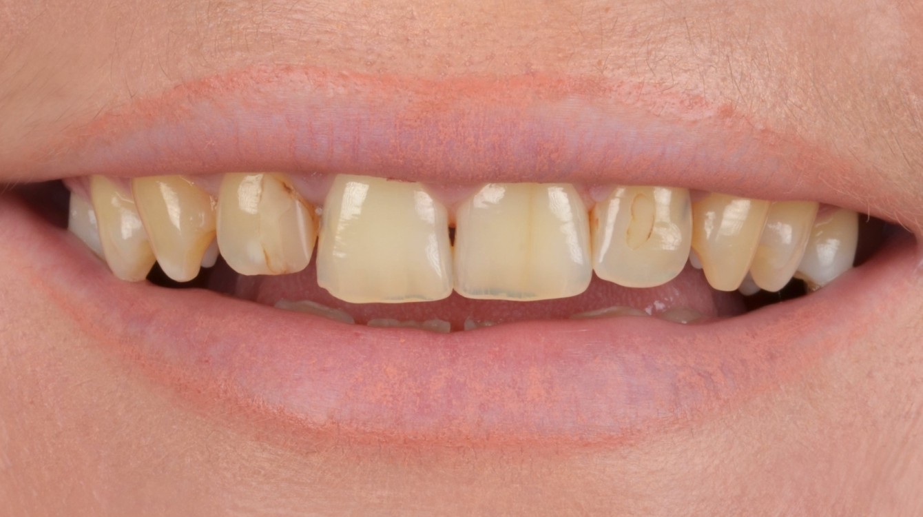 Ivana je u našu polikliniku došla u potrazi za najboljim rješenjem svog estetskog problema s osmijehom. Zubi su bili diskolorirani, uz dosta pigmentacije. Budući da su neki zubi bili liječeni i s dotrajalim kompozitnim ispunima, odlučili smo se za izradu cirkon-keramičkih krunica.